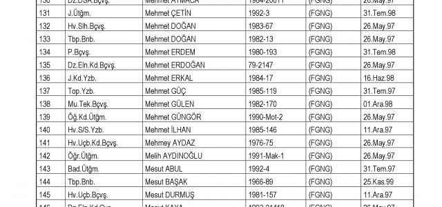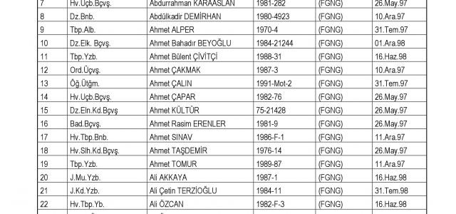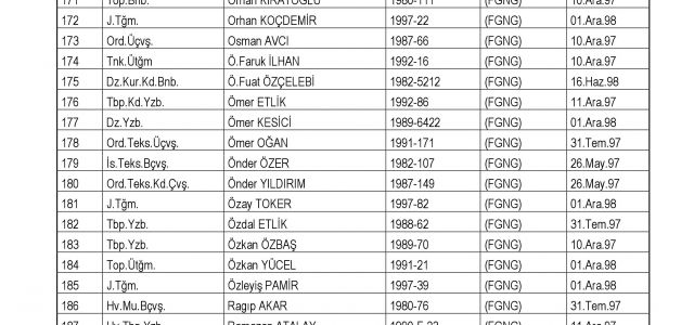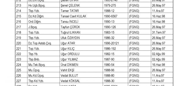 F.GÜLEN tarikatı ilişkisi / iltisakı nedeniyle TSK’dan ihraç edilen 243 personelin tam listesi aşağıdadır (bu liste dava ek klasörlerindeki yaş belgelerinden hazırlanmıştır) ;