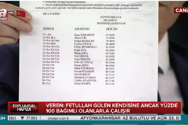– Nurettin Veren’in ahaber TV de 22 Ağustos 2016 tarihinde yaptığı programda, elinde dönemin Donanma Komutanı Güven Erkaya imza bloğu açılmış bir yazı göstererek FETHULLAH GÜLEN TSK ÇEKİRDEK KADROSUNUN bu evrakta yazılı olduğunu ve 1996 yılında Güven Erkaya adına imza bloğu açılmış evrakta; Gülen tarikatına mensup olduğu gerekçesiyle; “…Faaliyetlerinin takip edileceğini – “faaliyetleriyle ilgili kanaat oluşturacak, tespit ettiği hususları belgeleyerek tekemmül ettirdikleri evraklarla ilgili yönerge/yönetmelik esaslarına göre işlem yapacak veya işlem yapmak üzere Donanma Komutanlığına gönderilecektir “ emrinin ast birliklere gönderildiği anlaşılmaktadır.