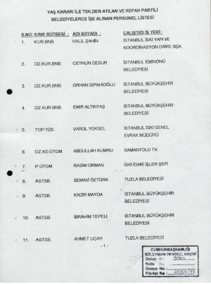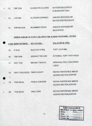 – O dönemde F. Gülen tarikatı ile iltisaklı olduğu tespit edilerek TSK’dan atılan yukarıda adı geçen TSK mensuplarından, o dönem hükumeti ve yerel yöneticiler tarafından kamu görevine kabul edildikleri tespit edilenler, hem Hükümete hem de Cumhurbaşkanına sunulmuştur. Cumhurbaşkanlığı Arşiv Dolap No: 91703 Fihrist No: 22357 78 /78 sayı ile muhafaza edilen bu belge dava dosyası ek klasörlerine delil olarak konmuş olmasına rağmen ne iddianamede ne de gerekçeli kararda delil/belgeler arasında değerlendirilmemiş, gizlenmiştir. Bu tür belgeleri değerlendirmeden kasıtla kaçıran yargı, o dönemde yapılan bu mücadeleyi karartmaya çalışmıştır.