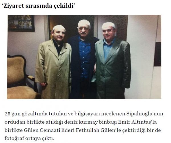 İddianamede ve gerekçeli kararda (s.1306, s.3541) TSK’dan asılsız ihbarlar, gerçek dışı raporlar, personelin askeri görev ve disiplin anlayışını yansıtmayan sicil notları ve sahte belgelerle FETÖ terör örgütü dışındaki “milli manevi değerlere sahip”sözde darbeye karşı çıkacak personel olarak tarif ettiği, Dz.K.K.lığına 1996 da sızan F.GÜLEN tarikatının 12 Kişilik Çekirdek Kadrosunda yer alan ve faaliyetleri tespit edilerek YAŞ kararı ile TSK dan atılan Orhan Sipahioğlu ve Emir Altıntaş’ın ABD de F.GÜLEN’i ziyaretleri sırasında çektirdikleri fotoğraf ;