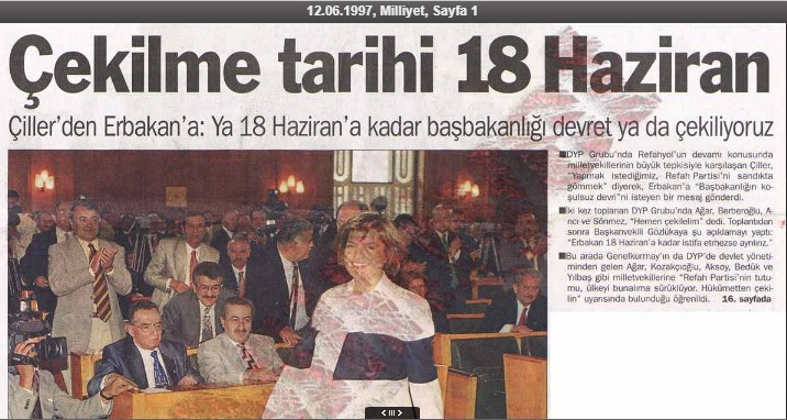 Dönemin Başbakan Yardımcısı ve DYP Genel Başkanı Tansu Çiller, yukarıda açıkladığımız gibi, 31 Mayıs 1997 tarihinde yapılan yeni koalisyon protokolü ile Haziran’ın ortasında Erbakan’ın istifa ederek Başbakanlık görevinin kendisine devredilmesi ve erken seçim kararı alınmasını sağlamıştır. Bu kararlar 1 Haziran 1997 de hem basına hem de Cumhurbaşkanına açıklanmıştır. Tansu Çiller’in bu siyasi gelişmeler ile basını da kullanarak Erbakan’ı istifaya zorladığı açıktır.