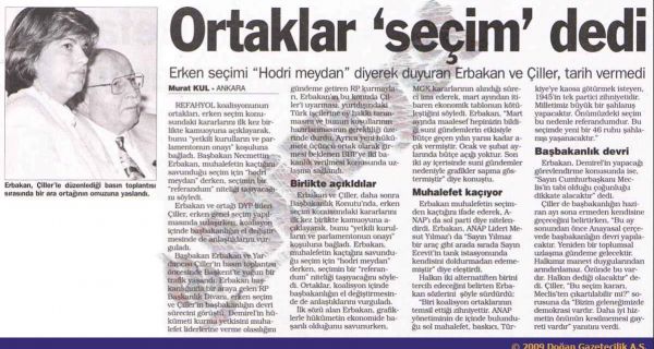 • “Erbakan başkanlığında bir araya gelen RP Başkanlık Divanı, erken seçim ve Çiller’in başbakanlığın devri sürecini görüştü. Demirel’in hükumeti kurma yetkisini muhalefet liderlerine verme olasılığını gündeme getiren RP kurmayları, Erbakan’ın bu konuda Çiller’i uyarması,(…) BBP’ye iki bakanlık verilmesi konusunda uzlaşma sağlandı