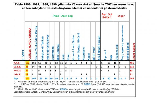 1996-1999 yılları arasında TSK’dan disiplinsiz nedeniyle ihraç edilen personel sayısı 746’dır. Personel isim listesi ve gerekçesi “YAŞ İHRAÇ KARARLARI” başlığında bulunmaktadır. TSK dan ihraç edilen 746 personelin tarikat bağlantılı ihraç gerekçelerin gösteren genel tablo aşağıdadır; Tablodan 243 kişi ile F.GÜLEN tarikatı iltisaklı personelin ihraç edildiği görülmektedir. Bu sayı, genel toplamın % 33 ünü ifade etmektedir.