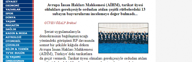 AİHM, tarikat mensupları oldukları gerekçesiyle TSK dan atılan çeşitli rütbelerdeki 13 subayın başvurularını incelemeye değer bulmamıştır.(23.07.2002 Milliyet “Türk Ordusuna AİHM desteği”)