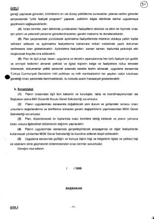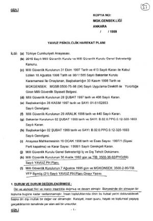 – BAŞBAKAN ONAYLI BU PLANDA;  Milli Güvenlik Kurulunun 31 Ekim 1997 Tarih ve 413 Sayılı Kararı ile Kabul Edilen 18 Ağustos 1998 Tarih ve 98/11585 Sayılı Bakanlar Kurulu Kararnamesi İle Onaylanan, Başbakanlığın 30 Kasım 1998 Tarih ve MGKGENSEK: MGSB:0500-75-98 (04) Sayılı Uygulama Direktifi ile Yürürlüğe Giren Milli Güvenlik Siyaseti Belgesine “İLGİ” ile atıf yapılmaktadır. 1999 tarihli bu plan dahil 1992 ve 1995 tarihli (değişme) Psikolojik Harekat Planları Bakanlar Kurulu karı olan MGSB kapsamında hazırlanmıştır. Bu husus MGSB’nin devletin milli siyasetinin ve siyasi iradenin esas belgesi olduğunu, içeriğinde iç tehdit ve unsurlarının, bu kapsamda “irtica” tehdidinin ve unsurlarının da sayıldığını, bu tehditle mücadelenin devletin milli siyaseti olduğunu ve bu konuda Genelkurmay Başkanlığına görev ve emir verdiğini doğrudan açıklamaktadır.