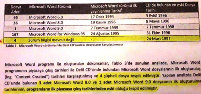 - Bilirkişi raporunda (G.K. 3414,3423,3426-28) yer alan, ancak gerekçeli kararda hiç söz edilmeyen önemli bir husus ise; Dosyaların 1994-1995-1996 ve 1999 yıllarında kullanımda olmayan, yani henüz piyasada bulunmayan Microsoft Word 8.0 ve 9.0 sürümleri ile oluşturulduğudur. Bilirkişi raporunun ilgili bölümü aşağıdadır,