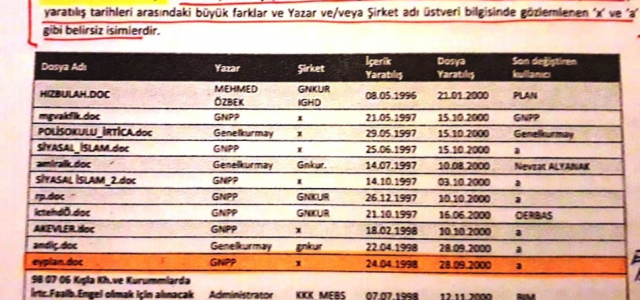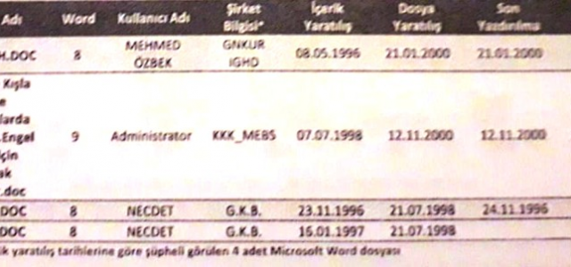 - Dosyaların oluşturulduğu bilgisayar tarihleri doğru kabul edildiğinde, içeriklerinde “Gizli” ve “Özel” ibareleri bulunan ve Genelkurmay’ın çeşitli birimlerine ait olduğu anlaşılan çok sayıda askeri içerikli dosya 1996 VE 2000 YILLARI ARASINDA, İSİMLERİ ASKERİ ŞUBE VE SANIKLAR İLE İLGİLİ ÇOK SAYIDA BİLGİSAYAR VE KULLANICI TARAFINDAN AÇILIP ÜZERİNDE ÇALIŞILDIKTAN SONRA KAYIT EDİLDİĞİ,