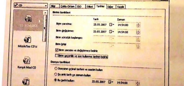 G.K s. 3412 ; CD’NİN ÜZERİNDE BULUNAN KAYIT TARİHİNİN KAYNAĞI, KAYIT YAPILAN BİLGİSAYARIN TARİH VE SAAT BİLGİLERİDİR. Bilgisayar V sistemleri tarih, saat ve zaman dilimi bilgilerini “genellikle” otomatik olarak güncellerler. Tarih ve saat bilgileri kullanıcılar tarafından saati kolaylıkla değiştirilebilir. CD imajından elde edilen zaman bilgilerine göre, dosyaların CD’ye 25 Mayıs 2007 tarih 14:54:00 saatinde \J GMT +3 zaman diliminde kayıt edildiği anlaşılmaktadır.